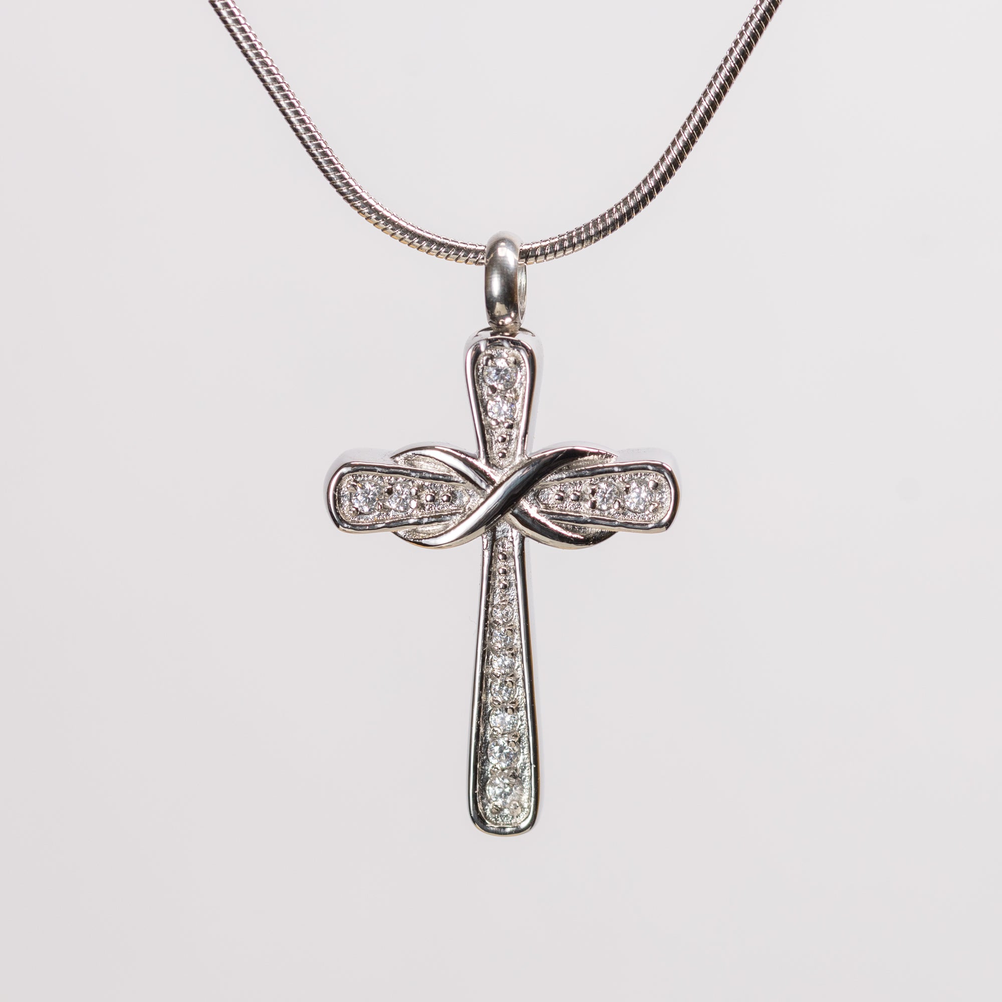 Silver Crystal Cross with Silver Infinity Cremation Urn Pendant