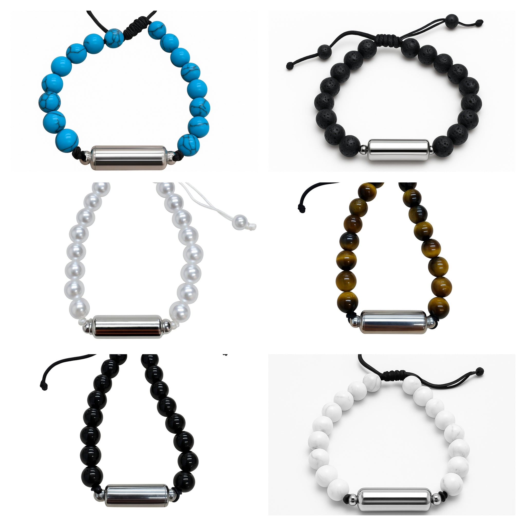 This bracelet is made of lava stones with a choice of colours, black, white or blue with a highly polished, solid 316L Stainless Steel cylinder to hold the ashes, this cylinder can be engraved.