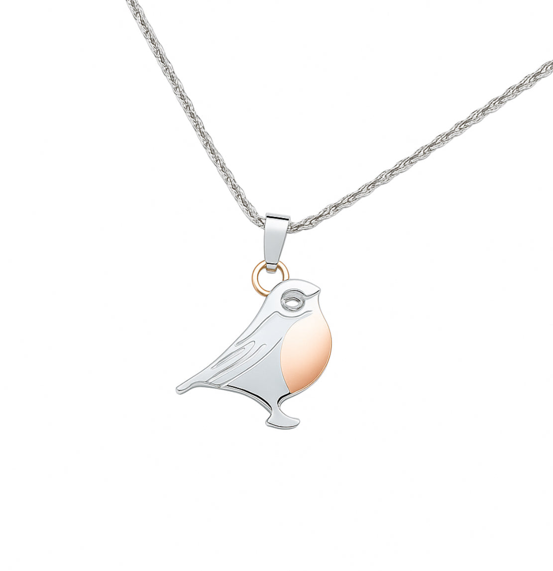 This highly polished, solid 316L Stainless Steel pendant is in the shape of a Robin with a Rose Gold breast and crystal eye design encapsulating stunning high quality craftmanship.