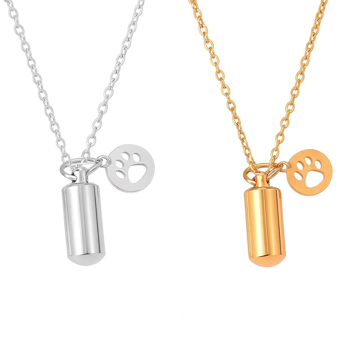 This urn pendant is cylindrical in shape with a paw charm. Designed to hold a small 'token' amount of a loved one or pet’s ashes, ensuring that there is always a part of them held close to your heart.