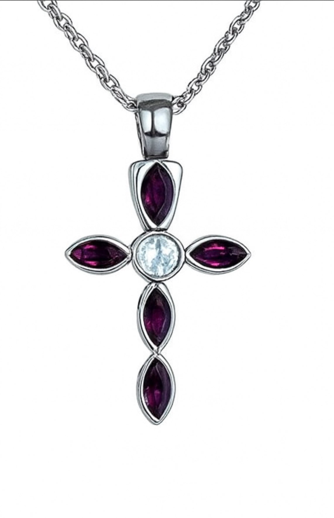 This highly polished, solid 316L Stainless Steel pendant is in the shape of a beautiful cross with purple and clear crystal detail.